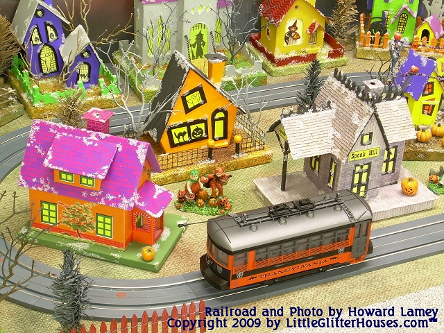 In this IssueAlthough Hollywood and other forces conspire to make each Halloween season more gruesome than the last, I don't let that ruin our efforts to provide family-friendly seasonal fun for our readers, our friends, and our own family. Dressing up in non-morbid costumes, eating candy corn, carving Jack-o-Lanterns, taking kids door-to-door in our neighborhood - why let the folks who are captivated by the macabre ruin these things for your family?One relatively new Halloween "tradition" is setting out holiday villages with fall or Halloween themes. We are still nuts about Christmas villages of all kinds, as you can tell from past postings and many articles on our web sites. But so many great family-friendly Halloween village products and projects are available, that I can't help getting excited about spreading a little seasonal joy, through our web pages and at least a bit of home decorating. And here's something else good about Halloween - no matter how gastly the ghosts and goblins are this year, the very next day is the start of an entirely different holiday season, one that reflects positive values. Yes there's a growing tendancy to "leapfrog" Thanksgiving and go right to Christmas, but I'll take Rudolph over Jason any day of the year. And yes, in case you wondered, we are retiring the Halloween photos after this newsletter - in fact as soon as I type this - because I have to prepare articles and photos for the Thanksgiving and Christmas season in advance. In fact, our most important article this month (and one of our coolest ever) is not a Halloween project at all. Its a tribute to the great old tinplate bridges that Lionel and other companies made to go with their toy trains in the early 1900s. Designer Howard Lamey has used this bridge with Halloween villages, with Christmas Villages, and with antique tinplate railroads, and it looks great in every setting so far. Looking ahead, our project developers have some clever, original, and - as always - inexpensive projects in the pipeline, so stay tuned. Once again, if you have an article idea or photo you want to share, please get in touch. Through our readers, we are constantly finding out new ways to enjoy our trains and towns. Topics discussed in this update include:
