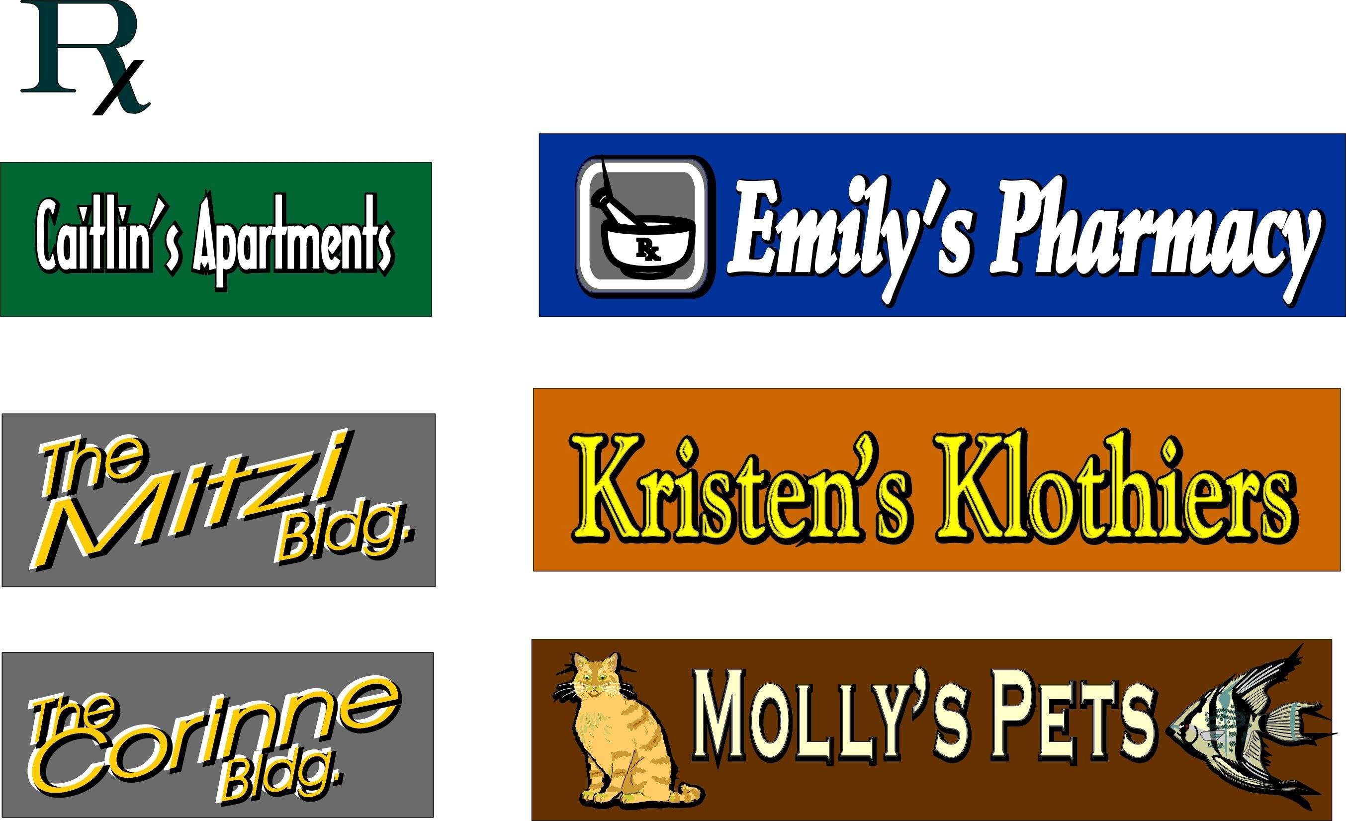 Business Signs 1(335K). These are some of the business signs I made up to go on my trashbashed Fisher Price storefronts Using an ALPS printer, I printed some of these "backwards" on clear stock, then superglued them to white plastic, so the "ink" side would be laminated on the inside of the sandwich, so to speak. Then I glued them on the front of businesses. I also printed a few similar signs directly onto white .010" sheets of plastic. Although I don't know if they'll hold up as well as the "sandwich" versions, they're a quicker process. Dave Watts, of Watts Trains, gave me a "shingle" of a pestle and mortar for the pharmacy. Thanks, Dave. If you try these, you'll have to resize them in a graphics program to get them to print right for your buildings. | ![]() | |
