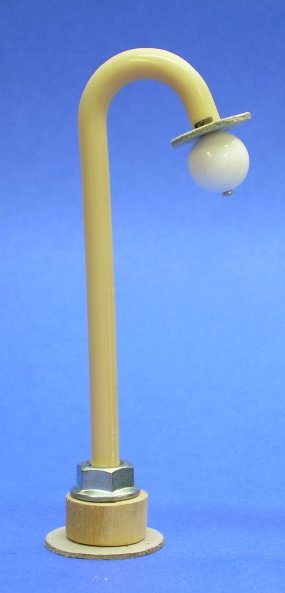 Note from Editor: Since Howard and I have been putting together the Tribute to Tinplate(tm) series, we have realized that authentic-looking period accessories help "cinch" the overall look of the tinplate era. This "goose-neck lamp post" doesn't actually light but, like the straignt-up-and-down lamp posts Howard developed to go wtih the "Lewis Park" tinplate station project, it brings back a whole era. And like most of our other Big Indoor Trains(tm) projects, it costs almost nothing to put together.