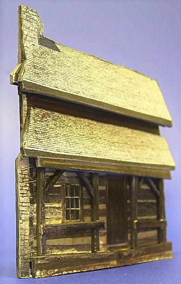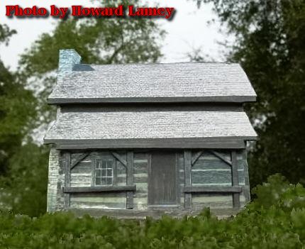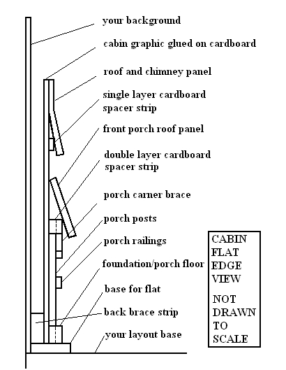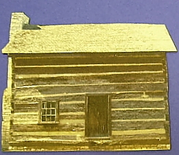 Note from Editor: Project designer Howard Lamey has made whole villages of vintage-style cardboard structures. This project is one result of me sending him a "care package" with many printed sheets from the Resources page. I sent him several sheets of the same log cabin photo with the idea that he might want to make a three-dimensional model from them. This is what he sent me. Easy Log Cabin FlatThis is an easy project that doesn't require much in the way of talent or fine measurements. It uses Paul Race's Log Cabin graphic, which is available in sizes suitable for Christmas villages or O scale/On30 railroads from Big Indoor Trains' Building Front Photos page. (For bigger sizes, go to the Family Garden Trains' Building Front Photos page.)This is a “layered” glue up project. The “layers” add just enough depth and show actual shadows. When viewed from straight on, or just to one side, it looks much deeper than 1/4-inch. All pieces for the cabin flat are cut from graphics which have been mounted on cardboard Making the Pieces