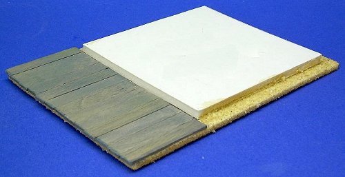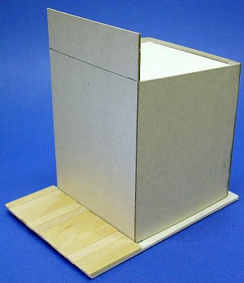 Building the BaseIt was my idea to make the "sidewalk" in front of the building into a "boardwalk." This will eventually give you a very nice place to set figures, fire hydrants, lamp posts, and the like.I made the base by laminating two pieces of the thin corrugated cardboard from Express Mail packages. You could laminate "matte" cardboard as well. The foundation should fit loosely inside the four sides of the building once it is assembled. Eventually, it will give you more surface for gluing the building down to the base reliably. That said, you don't want to glue the foundation to anything until the building is To create the boardwalk, I cut several popsicle sticks into two-inch lengths. Then I checked the fit of the building on the foundation. When I was sure of the fit, I glued the foundation and popsicle sticks down. I stained the popsicle sticks with watered down gray and driftwood color acrylic paint. I painted the base with tan (sand-colored) paint; then I glued on the popsicle sticks. Finally I glued sand over the part of the base that was still exposed. Work a little at a time, spreading white craft glue (like Elmer's), and tamping the sand into the glue. Building the Crest and Support![]() By making three of these at the same time, I could work on one while the other one was drying, and so on. Let the building frames dry at least overnight before you start applying the graphics - the last thing you need is a joint popping or the frame getting wobbly while you're trying to be precise with the graphic. Applying the GraphicsThen I carefully applied the graphic wraps to one wall at a time. I started on the sides, then did the back and front. I could have started with the backs just as easily, but the front definitely has to come last.
