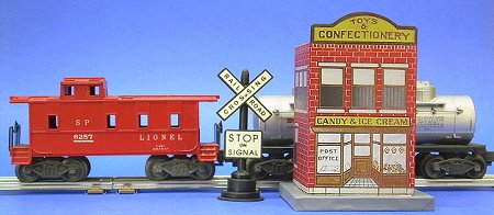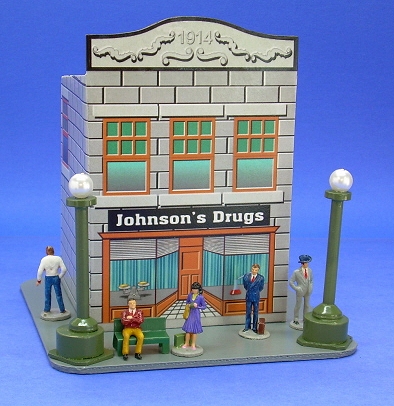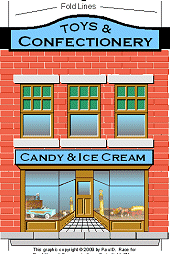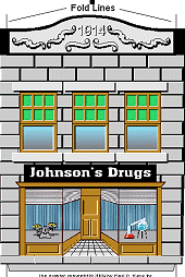 Like the For this project, we chose a series of candy containers that were made in the early-to-mid 1900s by West Brothers. Each container included a glass full of candy that you could see through the house's "windows." A photo of the candy tin that inspired the drug store project is at the left. Creating multiple "different" buildings by changing the graphics on the same basic structure was a favorite money-saving device of several tinplate toy manufacturers. The three buildings we have so far are inspired by specific tins for which we found photos. Of course, once I designed one of these, I just had to design a couple more. In the meantime, Howard kept trying out different ways to use the designs and sending me his feedback. The main reason we don't have four or five structures in this article is that we ran out of time. I have plans for at least two more storefronts that I hope to get to eventually. If you sign up for our Trains-N-Towns(tm) newsletter, we'll let you now when we create and upload more storefronts or other projects you might find helpful. Building TinPlate-Syle Store Fronts - from Big Indoor Trains(tm)After Paul and I started creating our first Tribute to Tinplate(tm)" buildings, we both started combing the Internet for photographs of worthwhile projects. The problem isn't lack of examples; it's that there are so many to chose from. After the Vine-Covered Cottage project, which turned out to be fairly complicated, Paul wanted to pick one that would be different than any we had done so far, simpler to build, and reusable just by changing the graphics. So the West Brothers' tin storefronts seemed like a good next project. That didn't keep me from giving him plenty of feedback, though. Still, when Paul sent the final graphic files and I printed them on a good color laser, I couldn't help getting excited about this project, and about how it would look with my tiny but growing O gauge Marx railroad.What You Will Need
