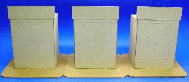 Building the BaseIt was Paul's idea for the base to represent a sidewalk/curb around the building. It will eventually give you a very nice place to set figures, fire hydrants, lamp posts, and the like. To provide room for such accessories, it extends one inch out to each side and two inches out front.I made the base by laminating two pieces of the thin corrugated cardboard from Express Mail packages. You could laminate "matte" cardboard as well. The foundation should fit loosely inside the four sides of the building once it is assembled. Eventually, it will give you more surface for gluing the building down to the base reliably. That said, you don't want to glue the foundation to anything until the building is complete and you have checked the fit one last time. To finish the base, I used gray paint to represent sidewalk. Because I had used corrugated cardboard, I was careful to dab paint into the edges to fill in the gaps. I probably could have used vinyl spackling do accomplish the same thing. If you wish, you can draw thin black lines on the base in a grid pattern to represent the sidewalk pattern; I've done that on other structures but I haven't done it on these yet. Building the Crest and Support![]() By making three of these at the same time, I could work on one while the other one was drying, and so on. Let the building frames dry at least overnight before you start applying the graphics - the last thing you need is a joint popping or the frame getting wobbly while you're trying to be precise with the graphic. Applying the GraphicsThen I carefully applied the graphic wraps to one wall at a time. I started on the sides, then did the back and front. I could have started with the backs just as easily, but the front definitely has to come last. At my insistence, each of Paul's graphics includes a little bit of extra material at the edges to take up any "slack" in case your measurements are an eighth of an inch off or something. Before you cut off the fold lines, hold the wrap up to the wall it is going onto and see how close the fold lines are to the actual corners. If they're close, fold the first wrap (a back or side) along one fold line, then hold it against the wall you will be using it on. Then, if it is necessary, you can adjust the other fold. When you're certain your fold lines are where they need to be, crease them sharply and cut the white parts off of the graphic. Spread a thin layer of glue over the entire wall to be glued, and along the edges where the extra bits will wrap around the corner. Then fasten the graphic down carefully. Consider using clothespins or the like to make certain the wrap doesn't shift during the drying process. Once the first "wall" has dried, you add the next wall, except that one of your "fold lines" on the next wall should actually be a "cut line" if your graphic pages are fitting where they need to be. Remember you may also be trying to align mortar lines at the same time, so take your time.