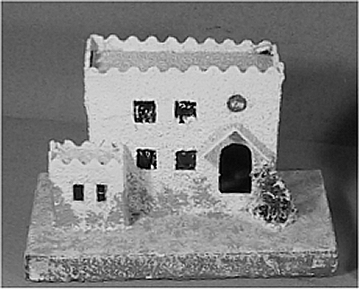 On that note, I have noticed that some of these structures had flat roofs with "parapets." I suspect that the designers thought they were imitating Bethlehem architecture to attract nativity-minded customers. On the other hand, Ted has found a line or two that look like they were made specifically to go with toy trains. So it's possible that the designers had both nativity-users and train-users in mind. Either way, the putz soon took on a "life of its own" in many homes.