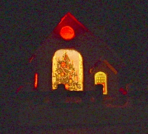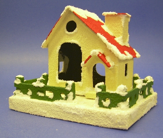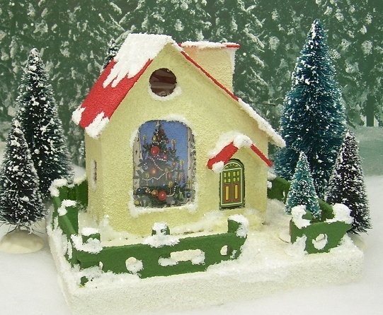 One of the relatively rare kinds of "putz" (Christmas cardboard village) houses was the "Picture Window House." This structure included a large front "window," that displayed a Christmas scene of some sort.