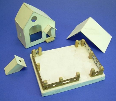 White glue works best if you apply a thin coat to each mating surface and wait a few moments for the glue to become tacky. Do not glue the house to the base yet.