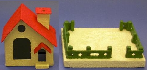 [Editor's note: For trees, some folks cut apart a loofah sponge and dip it into deep blue-green paint, wring it out, and let it dry to simulate the lichen-like organic material used on some of the original houses. - Paul]