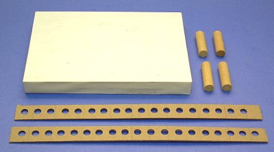 The base is a rectangular "box" that is decorated before the station is installed. For this project, it should be about 4"x6" and 1/2"-to-5/8" thick. The foundations are simpy rectangles that help the building and tower stay in place after everything is glued together. The fence is cut from thick cardboard, such as the back of a writing tablet, or the fine corrugated cardboard the Post Office uses for small shipping containers. I made the round holes in my fence with a heavy-duty paper punch.