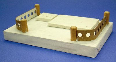 Assemble the Fence - After you've figured out where the structures will go by laying out the foundation pieces, decide where you will want the fence posts. Use a sharp knife (like a Xacto knife) to cut out shallow holes in the base where the fence posts will go. After you've glued those in place, bend and glue the fence as shown in the photo to the right. You will probably have to cut off some extra material.