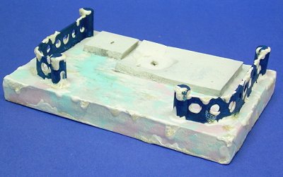 - Paint the base and fence (above right). A white base with random swirls and dabs of very light pastel blue and pink are a good choice. Paint the fence a color that ties in with the building but is dark enough to contrast with the base. I suggest you not use yellows, beiges or greens in the snow.